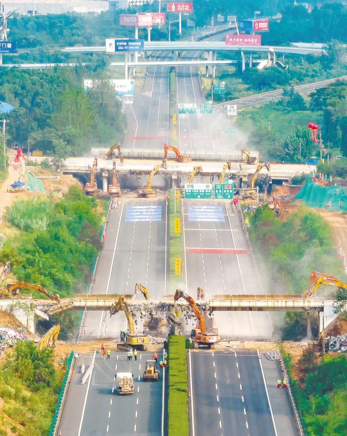 拆除难度大,时间紧迫。位于蔡甸区的318国道跨线桥、京港澳高速武汉段每天车流量达8.5万辆,拆除需协调单位45家。为提升桥梁拆除施工效率,湖北交投集团、中交二公局等单位精心谋划、严格管控,科学编制专项施工方案及专项应急预案,对施工工艺、安全管理等周密部署,实现318国道跨线桥提前4小时拆除,提前恢复交通通行。