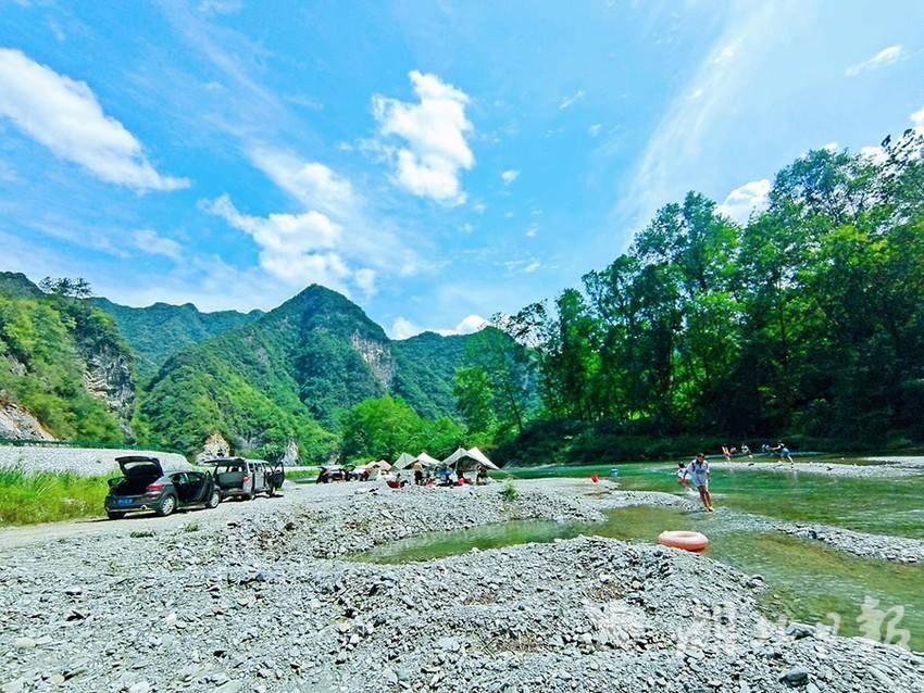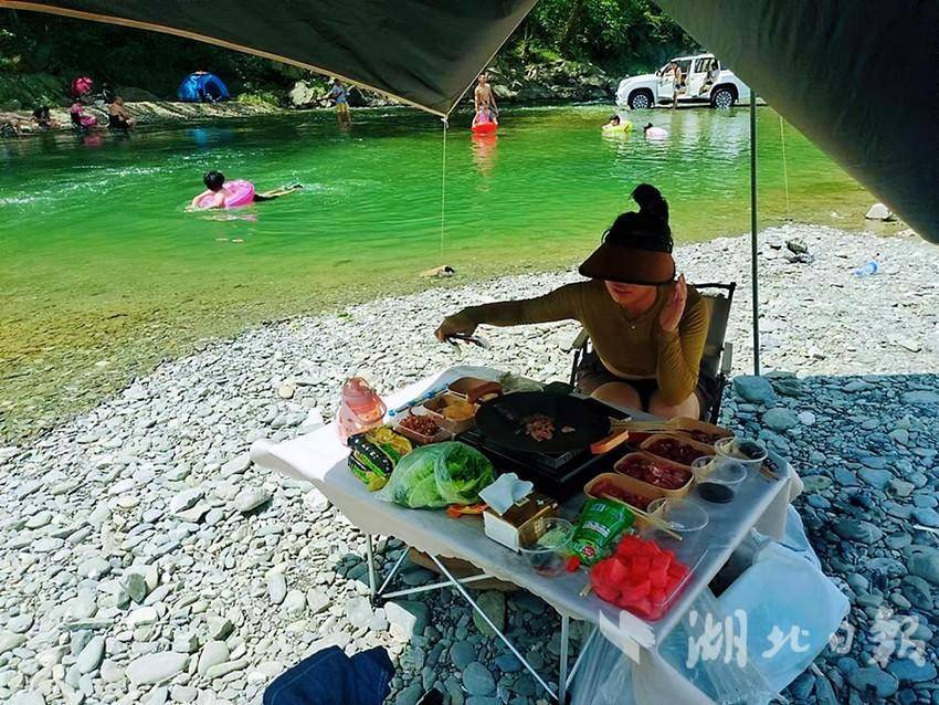 清风掠过、细雨洒落、异花舒绽、草木摇曳,渔坪村气候宜人,每逢节假日都有大量游客前来打卡游玩。游泳圈、小桌板、遮阳蓬、烧烤架、折叠躺椅……这就是午后最美的时光,大家沉浸在欢声笑语中,享受着天伦之乐,感受着大自然的美好。