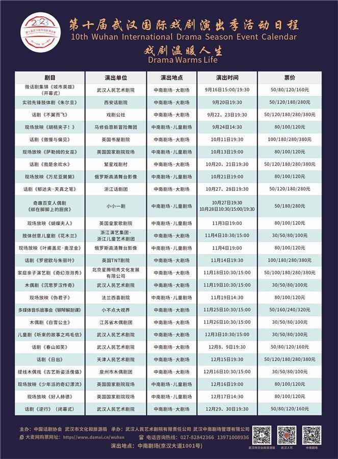 为了回馈观众,今年的演出季继续秉持惠民原则,最低票价30元,并推出“早鸟”超值购、99元剧目任选和套票兑换券等优惠活动,观众可以在大麦网、猫眼、武汉文惠通和抖音平台购票,也可添加剧场客服,进行“一对一”选座购票并享受相应优惠。