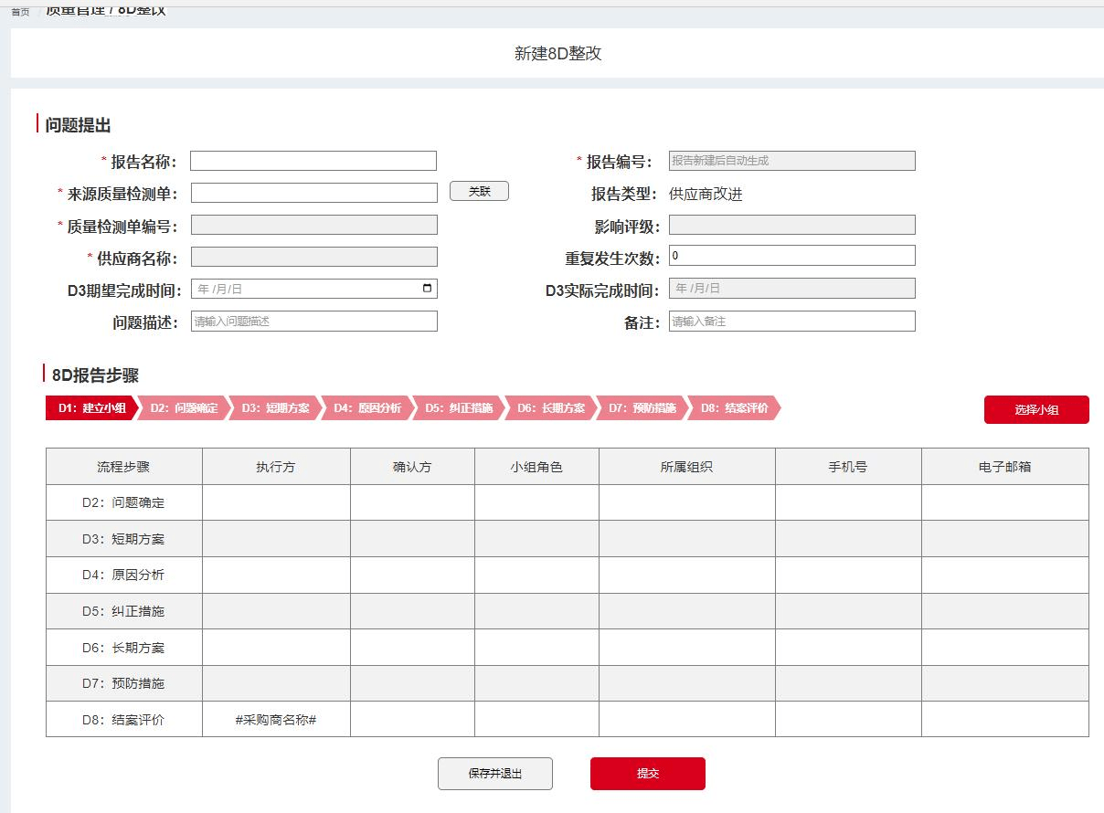 8D整改报告:支持企业对质量检测不合格的检测单发起8D整改报告,与供应商协同完成报告,对发生的质量问题给出解决方案。