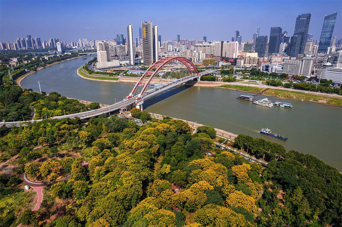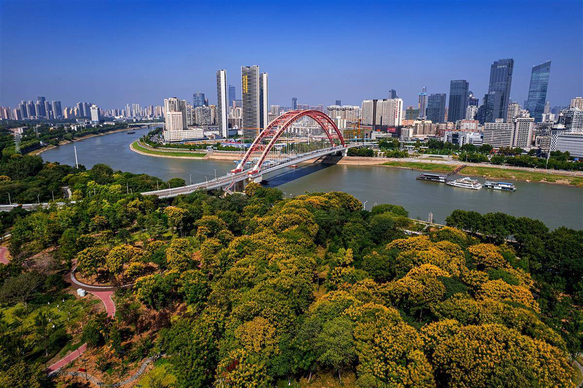 被称为武汉“城市之心”的南岸嘴,是长江和汉江交汇处形成的冲积地带,经多年的节点提升改造工程后,绿树成荫,秋季成片的栾树花美不胜收,成为江城秋日一道靓丽的风景线。