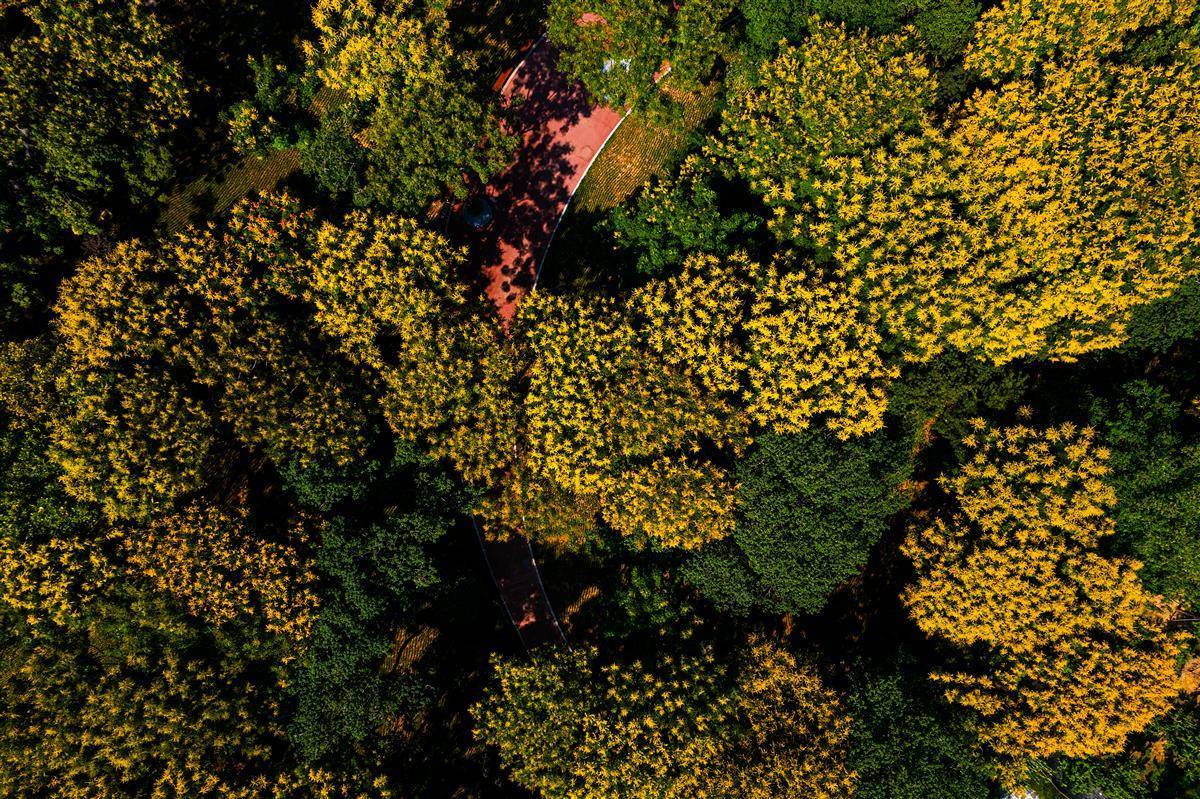 9月6日,在武汉南岸嘴滨江公园,一棵棵香樟、法桐、构树、栾树等大型乔木遍布园区内,特别是栾树花一簇簇盛放,金黄色的花海让江城秋意渐浓。