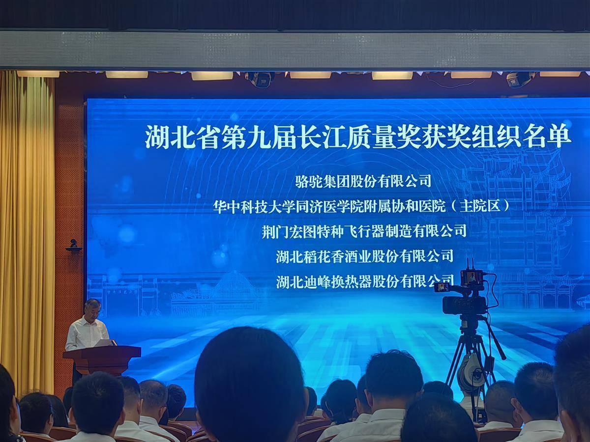 骆驼集团股份有限公司、华中科技大学同济医学院附属协和医院(主院区)、荆门宏图特种飞行器制造有限公司、湖北稻花香酒业股份有限公司、湖北迪峰换热器股份有限公司等5家企业(组织)获得湖北省第九届长江质量奖正奖。此外,湖北天门纺织机械股份有限公司、荆门市城市水务集团有限公司、武汉华星光电技术有限公司、卓尔智联集团有限公司、驰田汽车股份有限公司5家企业获提名奖。