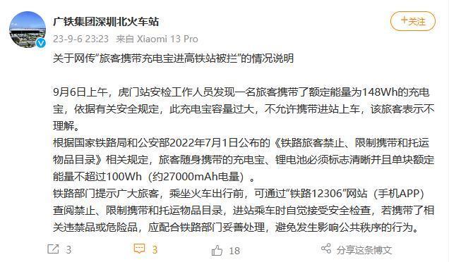中新网9月7日电 针对网传“旅客携带充电宝进高铁站被拦”,广铁集团深圳北火车站6日晚在官方微博发布情况说明。