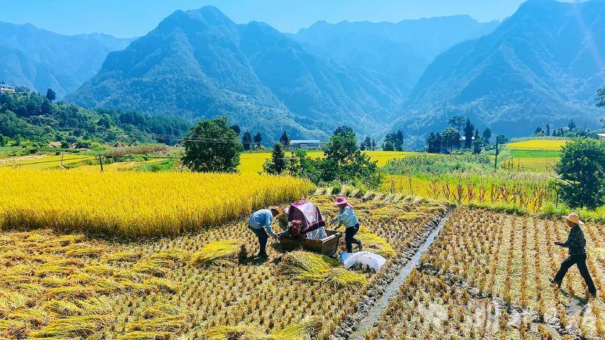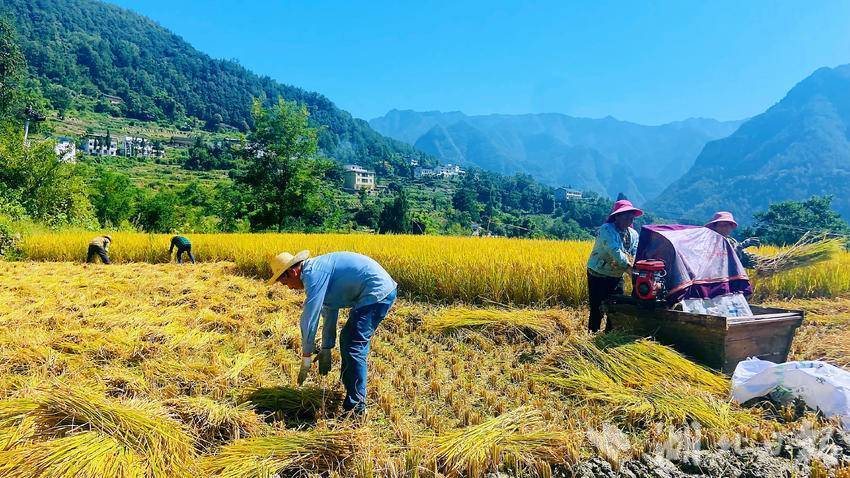 湖北日报客户端讯(通讯员廖逸婷、谭云艮)9月6日,烈日下的金黄稻田弥漫着稻香,巴东县溪丘湾乡甘家坪村7组的杨卜雄一家抢抓晴好天气,用自己的镰刀和小型脱粒机采收稻谷。