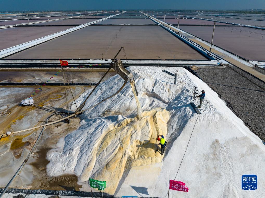 9月7日,在江苏省盐城市响水县,工人在江苏省银宝盐业有限公司的盐田里扒盐(无人机照片)。
