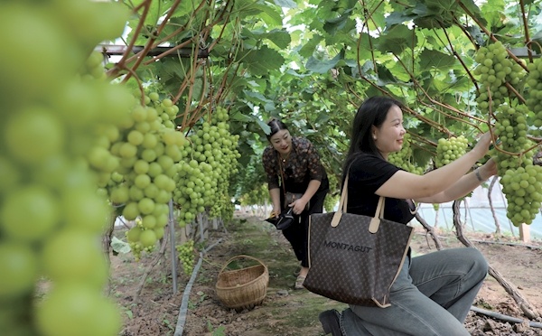 9月6日,郧阳区青曲镇洪门铺村捉马山葡萄园内,一串串颗粒饱满的阳光玫瑰葡萄挂满枝头,游客们喜笑颜开忙着采摘。近年来,青曲镇依托良好生态优势,积极引导农户种植特色农作物,把农业生产和观光采摘、乡村旅游有机结合,有效拓展农民增收渠道,助力乡村振兴。记者潘世新通讯员王博摄