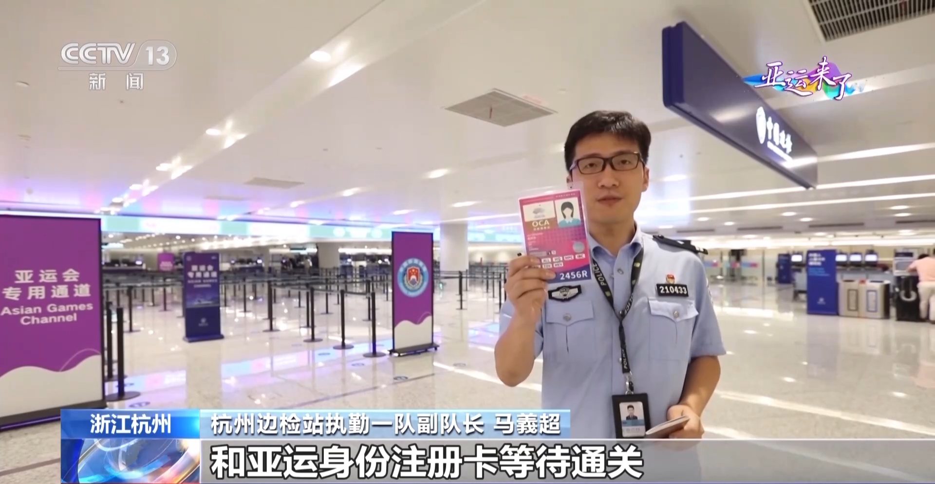 杭州边检站执勤一队副队长 马義超:我们提前组织开展了全流程全要素抵离演练和通关保障压力测试,在候检大厅设置了中英文对照的亚运会通关指示标识,在执勤现场升级查验系统。