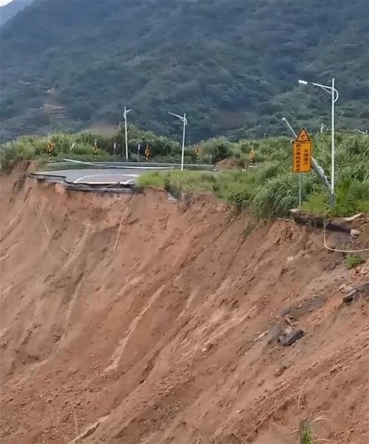 现场视频显示,在一公路拐弯处发生大面积塌方,塌方形成了滑坡,公路被截断。视频发布者配文称:“揭西县大洋乡一路段塌方,有两辆车掉下去了。”