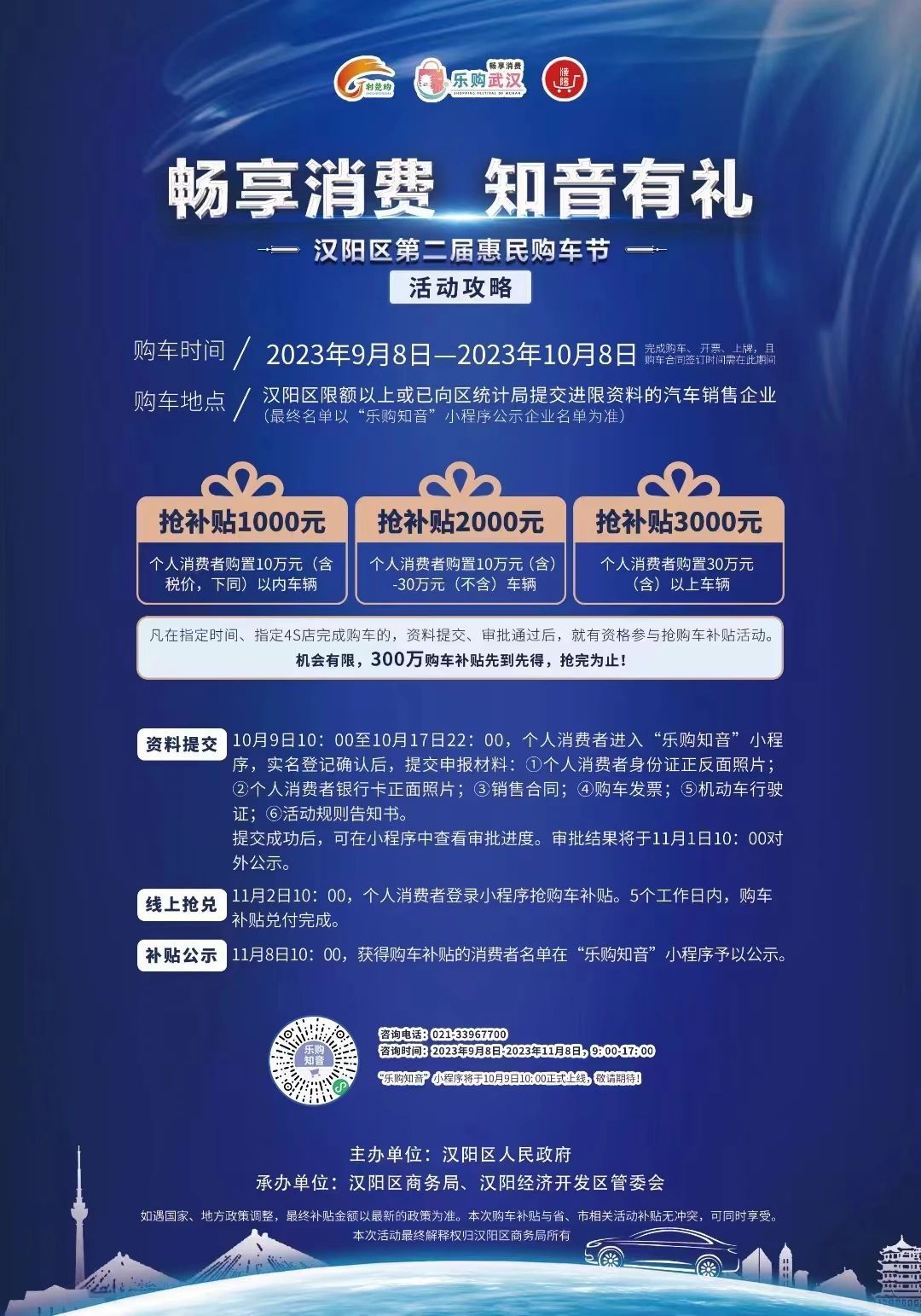 本次活动从9月8日起至10月8日止。个人消费者在汉阳购车除享受商户折扣优惠的同时,最高可获得汉阳政府3000元现金补贴。