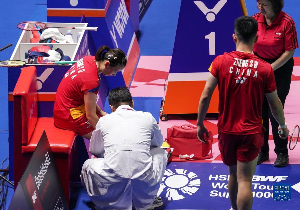 9月8日,黄雅琼(左一)在比赛中接受治疗。新华社记者 杨磊 摄