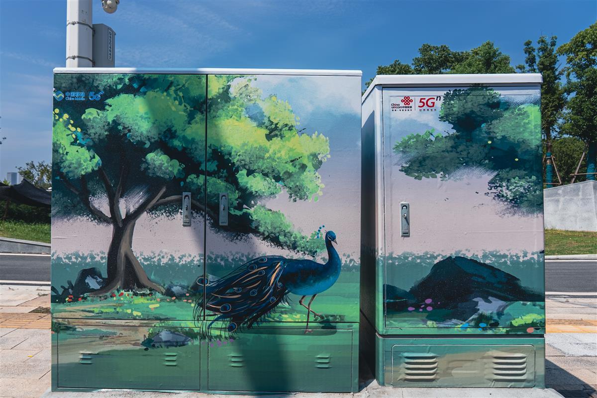 在马沧湖路,两个光电箱上,一只雄性孔雀优雅地散着步。汉阳城管局以动物园内动物为主题,采用新型美化贴布,对这里的17个光电箱进行美化,新型美化贴布采用新型纳米材料制作,具有防张贴、防涂鸦、防水防老化等功能,营造出特有的观光氛围。