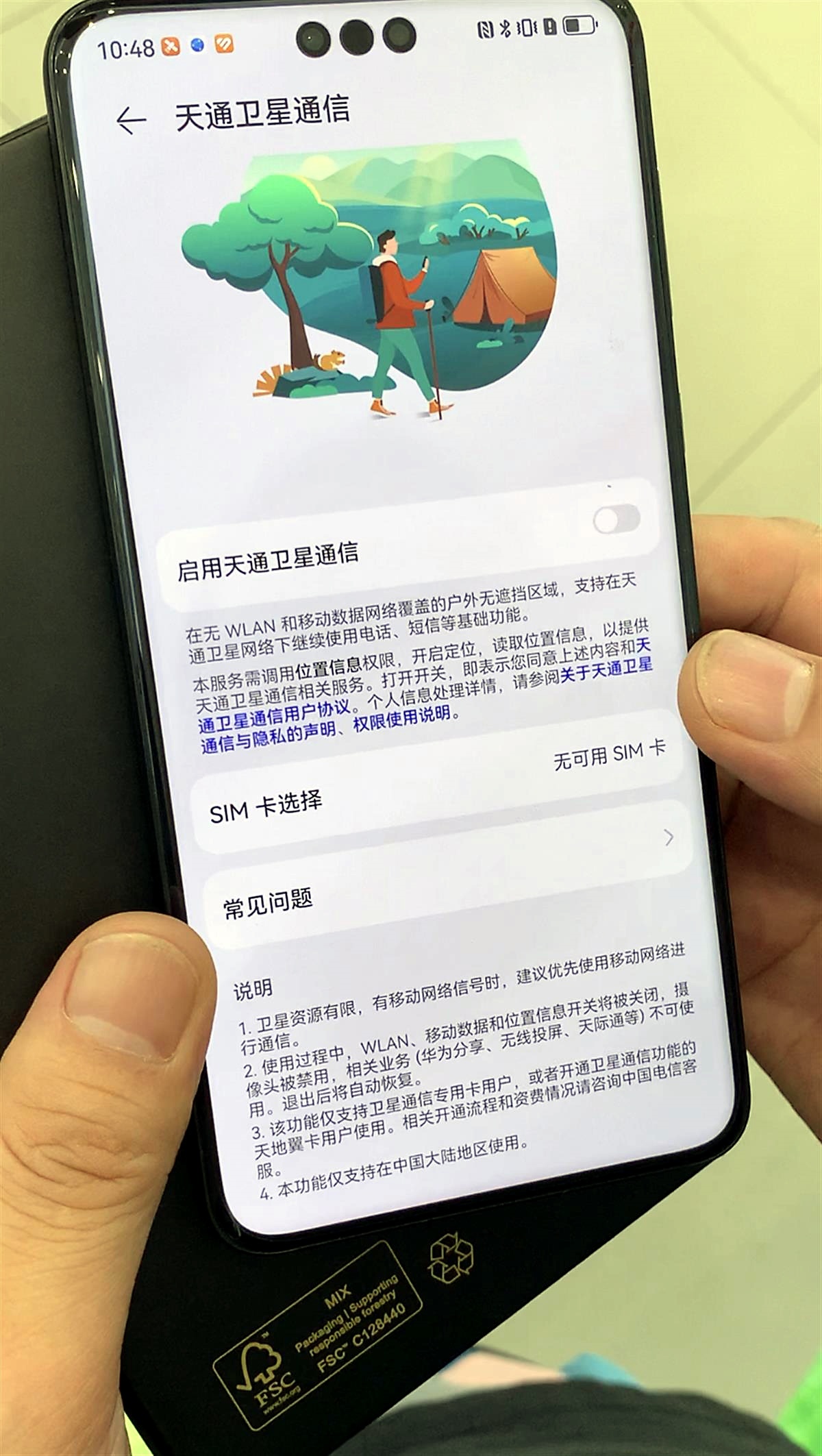 9月8日,熊先生来到湖北电信洪山广场营业厅,拿到手机后当场就开通了卫星通话功能。“没有网络信号的地方,也能通电话!”熊先生演示道,只见他打开手机设置功能,手机页面除了WLAN、蓝牙、移动网络等常规功能设置后,还多了一项卫星网络设置,点击“卫星网络”后,页面上就出现了“天通卫星通信”,显示通过天通卫星网络拨打电话和收发短信,仅支持电信卡或卫星专用卡,再点击“启用天通卫星通信”按钮即可启用。