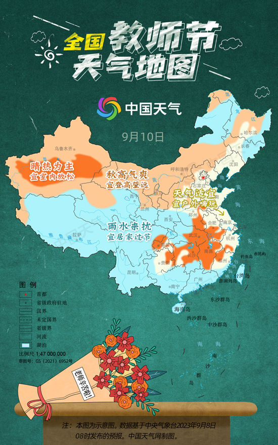 “桃李满天下,雨露润春华。”本周日(9月10日)是一年一度的教师节。今年教师节恰逢周末,辛勤的园丁们终于可以度过一个轻松的节日了。我国各地天气如何?适合怎样的过节姿势?中国天气网特别推出2023年全国教师节天气地图,请各位老师查收。