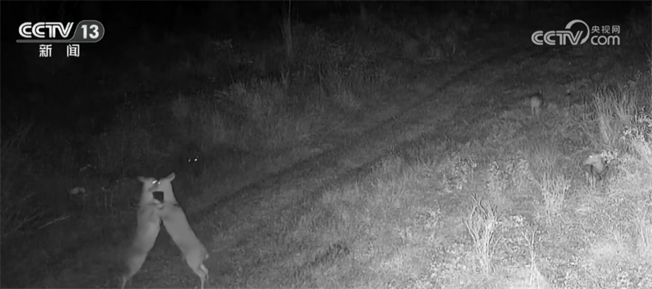 画面中,利用鹿角顶撞对方进行搏斗的是两只雄性海南坡鹿,它们正在通过这种方式角逐“鹿王”。另一画面中,两只雌性海南坡鹿后腿站立,利用前肢相互“挥拳”进行打斗,在一旁的雄鹿不紧不慢地过来将两只缠斗在一起的雌鹿分开,结束“战斗”。海南坡鹿是特产于海南岛的热带珍稀鹿种,属国家一级保护动物。