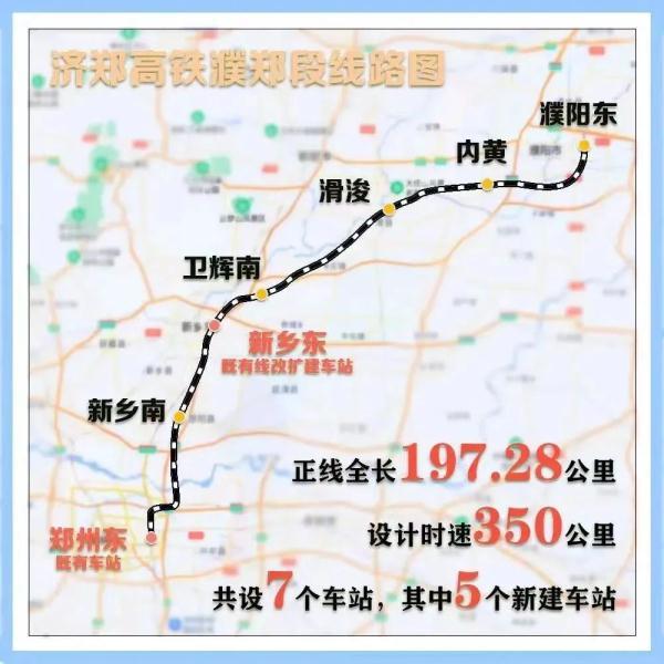 济郑高铁线路全长约407公里,濮郑段线路全长约197公里,已于2022年6月20日开通运营;济濮段线路全长约210公里,其中山东段全长约170公里,濮阳至鲁豫省界段约40公里。