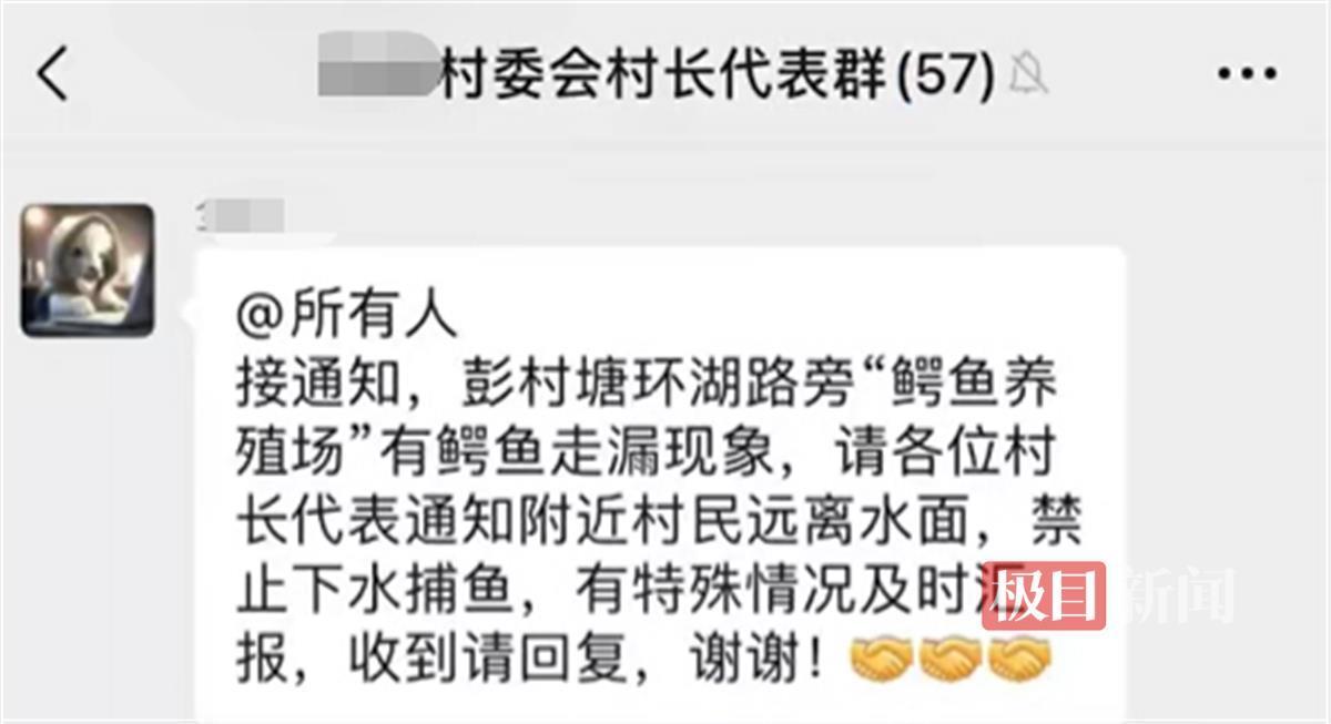 11日下午,极目新闻记者咨询彭村村委会工作人员了解到,附近确有养殖场出现鳄鱼出逃情况,不过该养殖场并不归该村管辖,她不清楚具体情况。目前,村里已向村民下发通知,让他们不要外出下水。