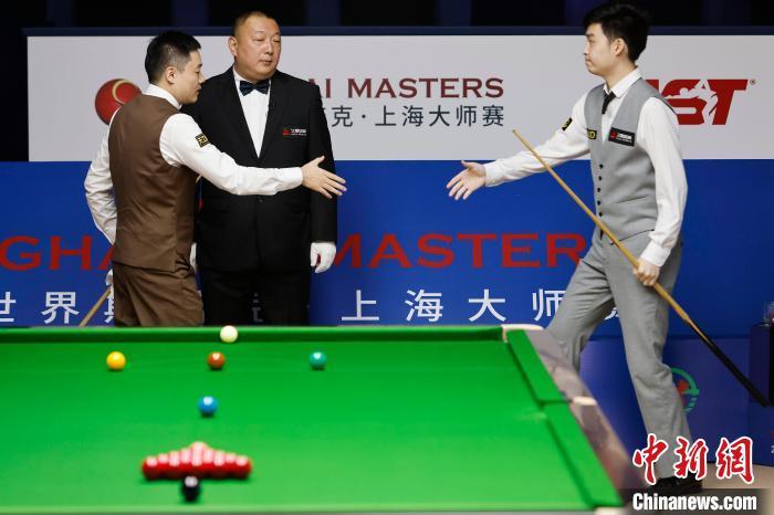 开幕式后,“中国一哥”丁俊晖(左)和斯佳辉的“中国德比”在1号台进行。中新网记者 殷立勤 摄