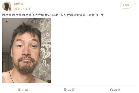 今年8月29日深夜,胡歌发微博:“我尽量,我尽量,我尽量保持冷静。我对不起好多人,我希望对得起这短暂的一生。”他还配上一张头发凌乱、胡子拉碴的自拍,左眼的伤疤清晰可见。