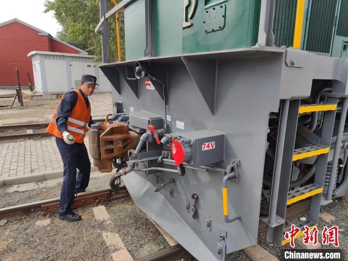 张晓军同事在检查中欧班列机车。姜辉 摄