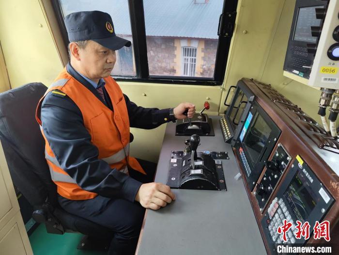 张晓军在驾驶室对中欧班列机车进行最后的检查。姜辉 摄