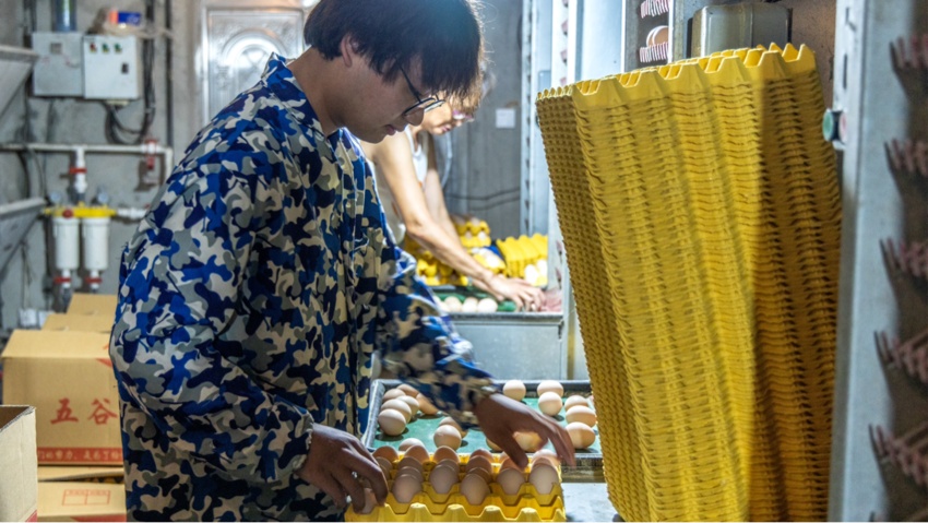 与传统的散养、圈养、人工养殖不同,为了保证鸡舍的卫生、舒适,避免过多人来往对鸡群的影响,张伟在设备配置上下足了功夫,所有大棚都配备了全自动养殖设备,每个标准化的自动化层叠式鸡舍里只有1个饲养员,喂料、喂水、通风、控制温度湿度、集蛋、分选等流程都是自动化。张伟在校学的是电气自动化专业,这让他在养鸡场自动化设备调试维修工作上得心应手,成为了父亲张齐刚的好帮手。
