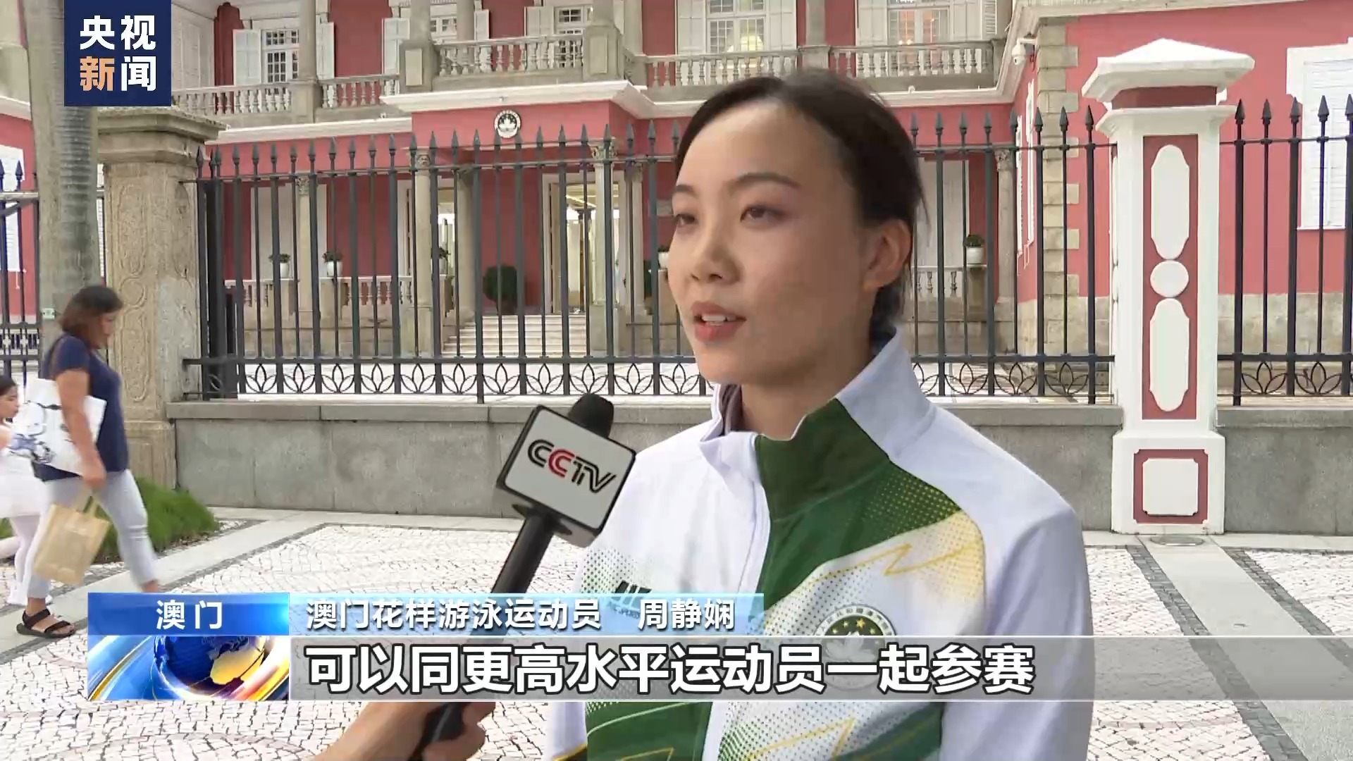 澳门花样游泳运动员 周静娴:我是第二次参加亚运会,上一次亚运会我们取得第八名的成绩,很开心这一次可以同更高水平运动员一起参赛,希望我们可以取得更好的成绩。