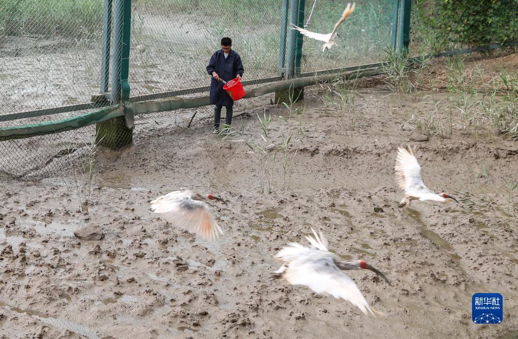 蔡新杰在给朱鹮投放食物(2023年8月21日摄)。新华社记者 杨磊 摄