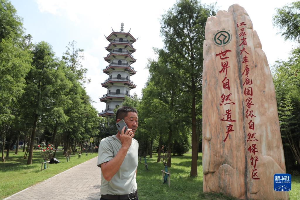 徐安宏在和同事电话沟通(2023年8月21日摄)。1986年,大丰麋鹿自然保护区成立,并从英国引进第一批麋鹿,隔年,从事兽医工作的徐安宏调到麋鹿保护区工作,只知道“四不像”的他第一次接触到麋鹿,从此与麋鹿结缘。30多年来,他一人多岗,忙碌在饲养、巡护、救助、普法宣传等工作一线,与保护区共发展共成长。1998年11月,第一批麋鹿开始野生放养,目前野生种群麋鹿已达到3356头。新华社记者 杨磊 摄