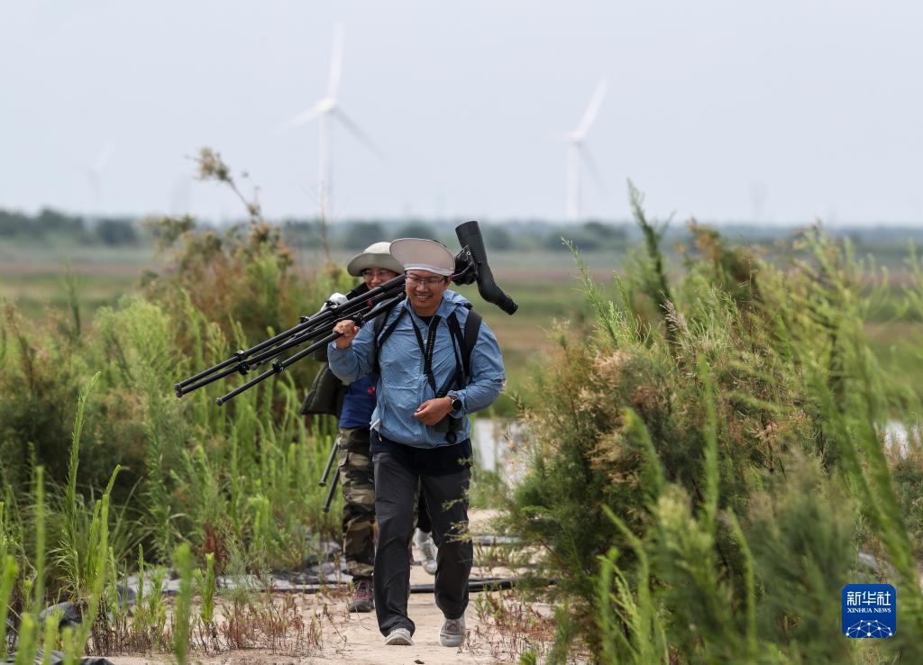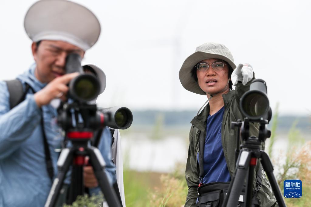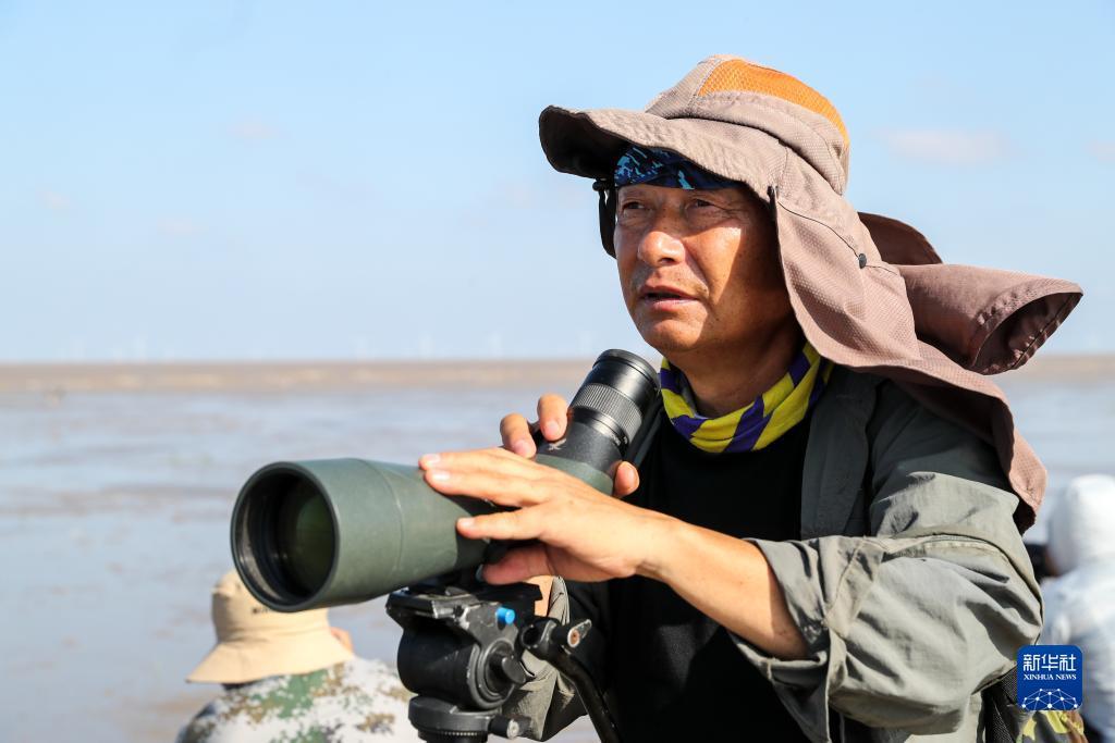 贾亦飞在东台条子泥湿地统计鸟群数量(2023年8月19日摄)。新华社记者 季春鹏 摄