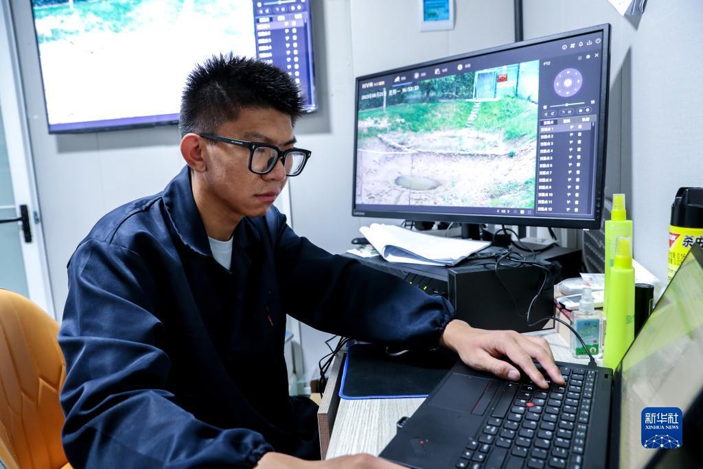 蔡新杰在纪录朱鹮野化食物转换的资料数据(2023年8月21日摄)。2000年出生的蔡新杰是江苏盐城国家级珍禽自然保护区鸟类研究中心丹顶鹤饲养员,目前在朱鹮野化放归项目组工作,从事食物转换实验。新华社记者 杨磊 摄
