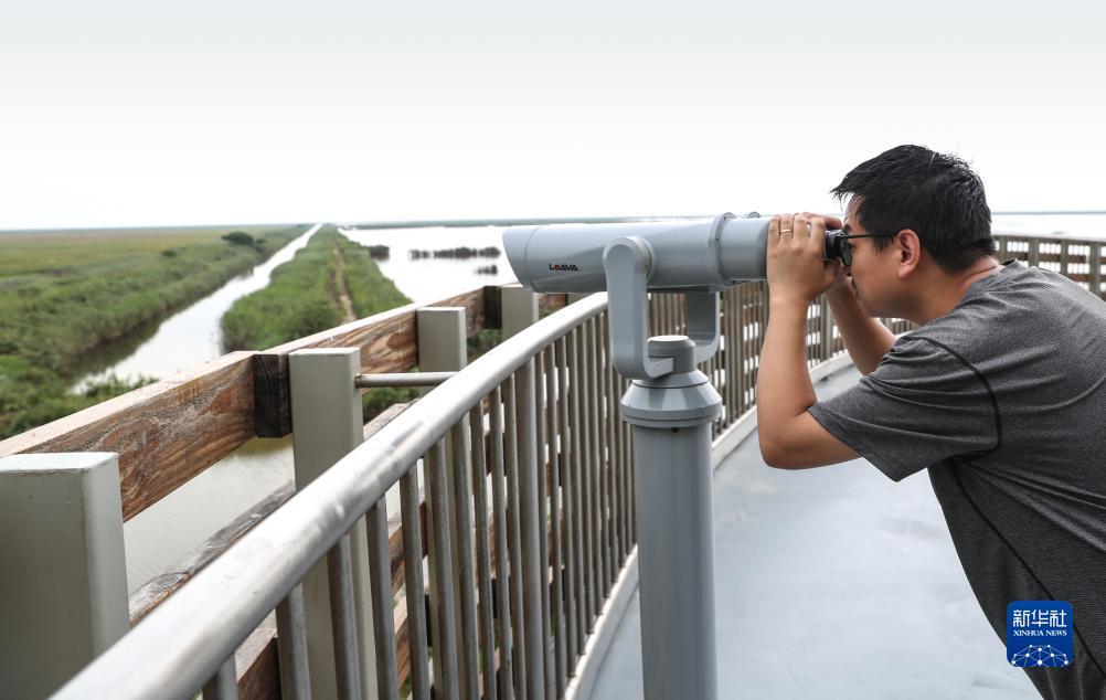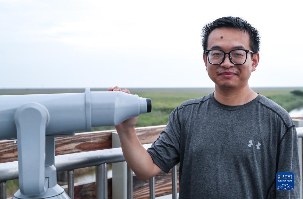 李征浩在观鸟台上(2023年8月21日摄)。2018年起,李征浩在江苏盐城国家级珍禽自然保护区管理处资源调查与监测科从事湿地生态和生物多样性监测、退化湿地恢复等工作,鸟类多样性调查和监测是其中的重要工作内容。“保护区地处偏僻、工作条件艰苦,但是因为热爱,所以坚持,我一入行就爱上了这个职业,打算一直干下去。”目前,他作为主要发明人获得授权湿地监测与保护的相关专利已有8项。新华社记者 杨磊 摄