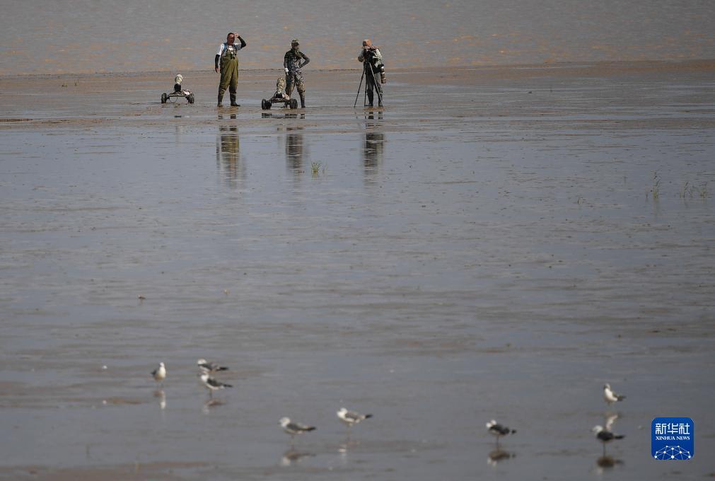 李东明(右)在东台条子泥滩涂上调查拍摄鸟类(2023年8月19日摄)。鸟类调查员、摄影师李东明1963年出生,原本经营着一家图文社,从2009年开始观察、拍摄候鸟。2019年,他成为东台条子泥湿地的一名鸟类调查员,起早摸黑,风吹雨打,通过摄影积累了大量图片与视频资料,更是多次观察拍摄到全球仅剩600余只的勺嘴鹬,大家都称他为“勺子王”“鸟博士”。目前条子泥湿地记录的412种鸟中,他已拍到200余种。新华社记者 杨磊 摄
