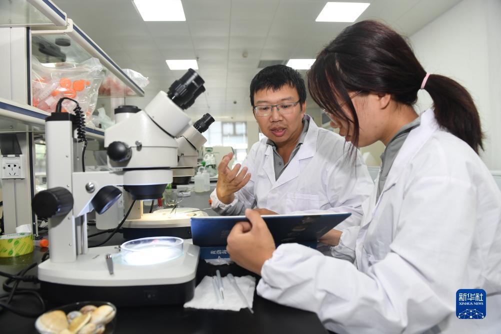 贾亦飞在东台野外研究站实验室教授学生底栖动物样品的分类和鉴定知识(2023年8月20日摄)。新华社记者 季春鹏 摄