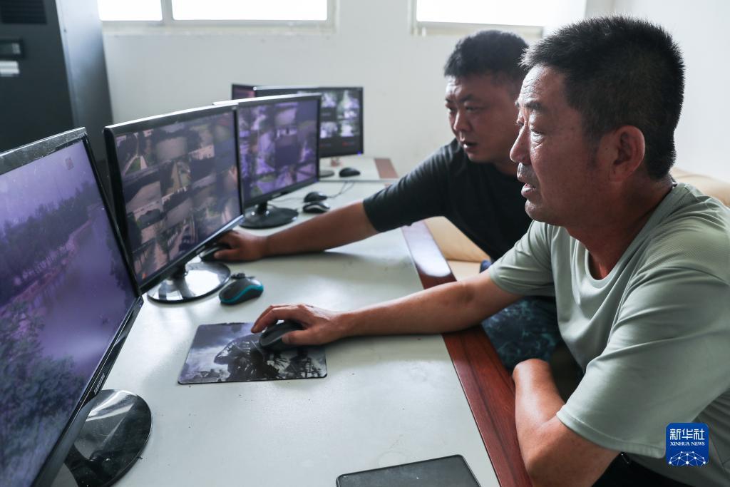徐安宏(右)在监控室里观察麋鹿情况(2023年8月21日摄)。新华社记者 杨磊 摄