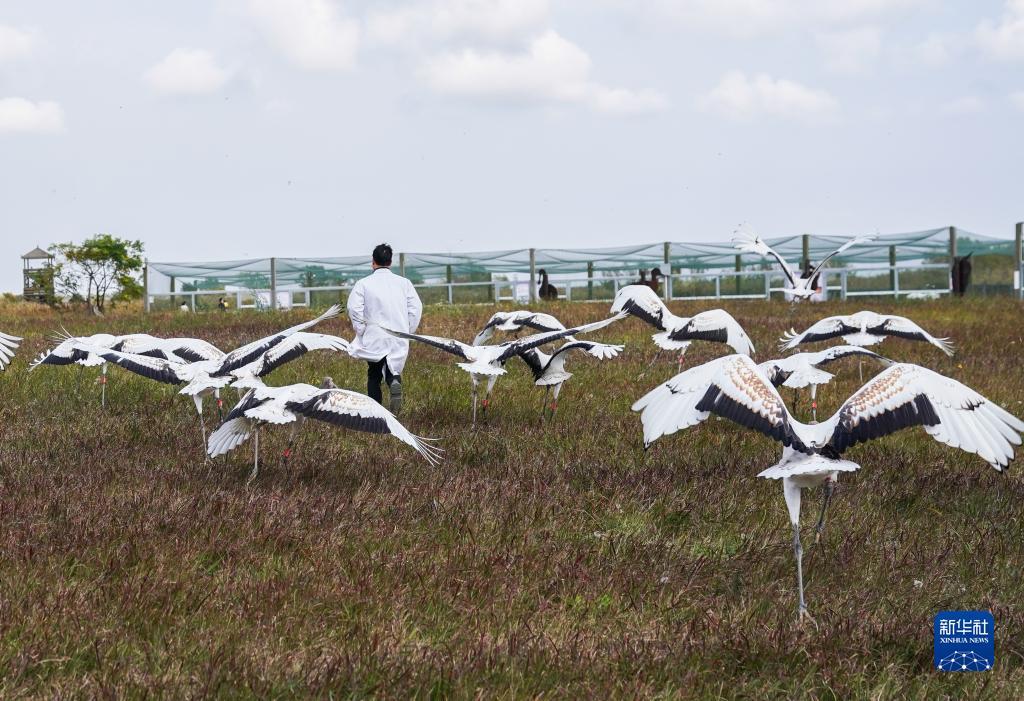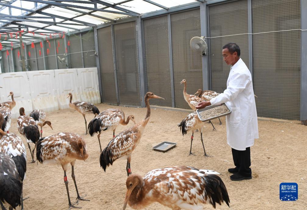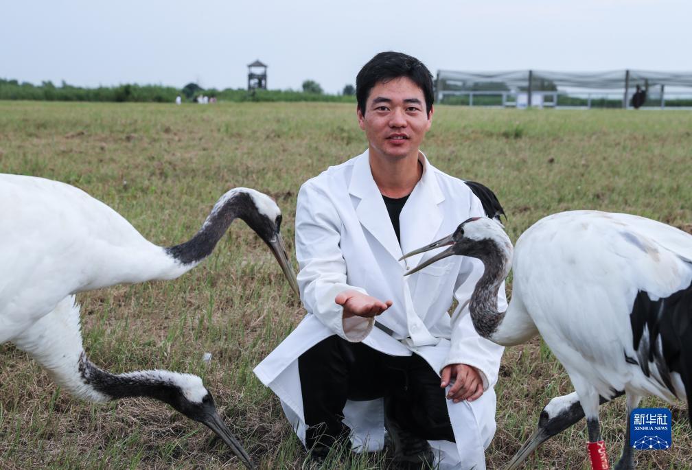 姜官宏在野化训养丹顶鹤(2023年8月21日摄)。姜官宏在江苏盐城国家级珍禽自然保护区管理处下属鸟类研究中心从事丹顶鹤的人工孵化、人工育雏等工作。截至目前,他和团队共育成丹顶鹤一百多只。新华社记者 杨磊 摄