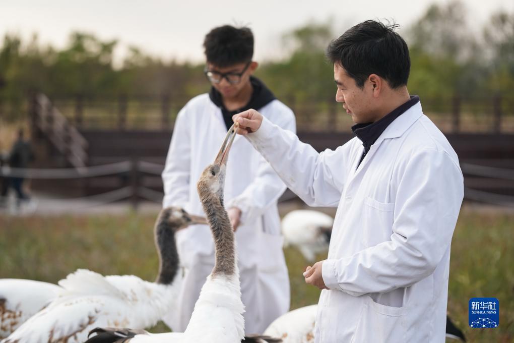 姜官宏对人工繁育的丹顶鹤进行野外放飞训练(2022年11月8日摄)。新华社记者 季春鹏 摄