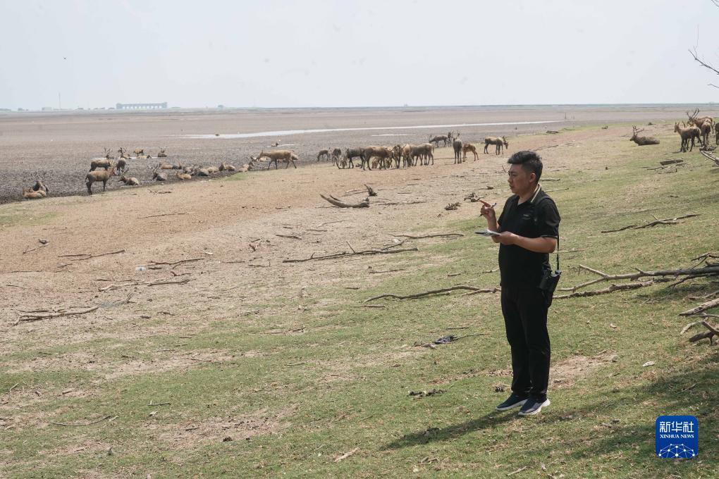 刘彬在保护区记录麋鹿种群数量(2023年8月21日摄)。新华社记者 季春鹏 摄