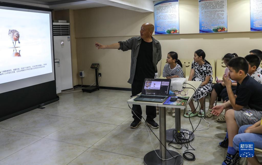 李东明在客栈为游客介绍普及鸟类知识(2023年8月19日摄)。新华社记者 杨磊 摄