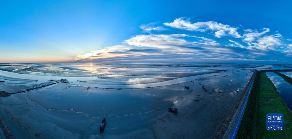东台条子泥湿地日出时分(2023年9月1日摄,无人机照片)。新华社记者 季春鹏 摄