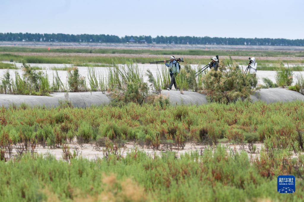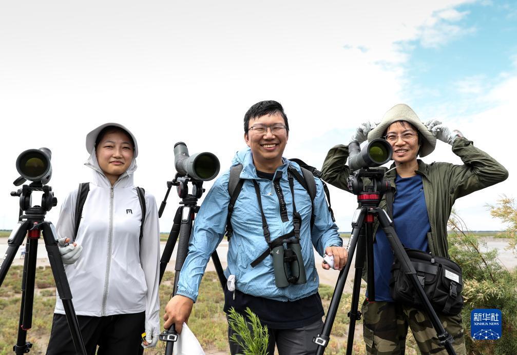 贾亦飞(中)和他的团队成员杨洪燕(右)、付婷(左)(2023年8月19日摄)。贾亦飞副教授来自北京林业大学生态与自然保护学院东亚-澳大利西亚候鸟迁徙研究中心,是东台野外研究站的负责人。他从2014年开始研究中国滨海湿地保护与管理,通过长期的鸟类与底栖动物监测,系统研究条子泥湿地与关键水鸟-底栖动物-环境耦合关系,从事极危物种勺嘴鹬等小型鸻鹬类食物资源、濒危物种小青脚鹬的种群动态等多个方面研究工作。新华社记者 杨磊 摄