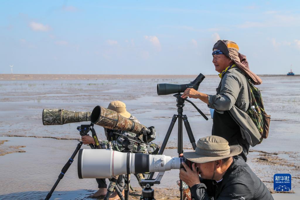 李东明(右一)带领摄影爱好者在条子泥湿地滩涂上拍鸟(2023年8月31日摄)。新华社记者 季春鹏 摄