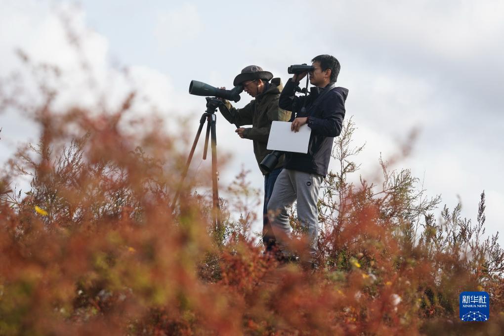 贾亦飞(左)、杨洪燕(右)在野外考察鸟类(2023年8月19日摄)。新华社记者 杨磊 摄