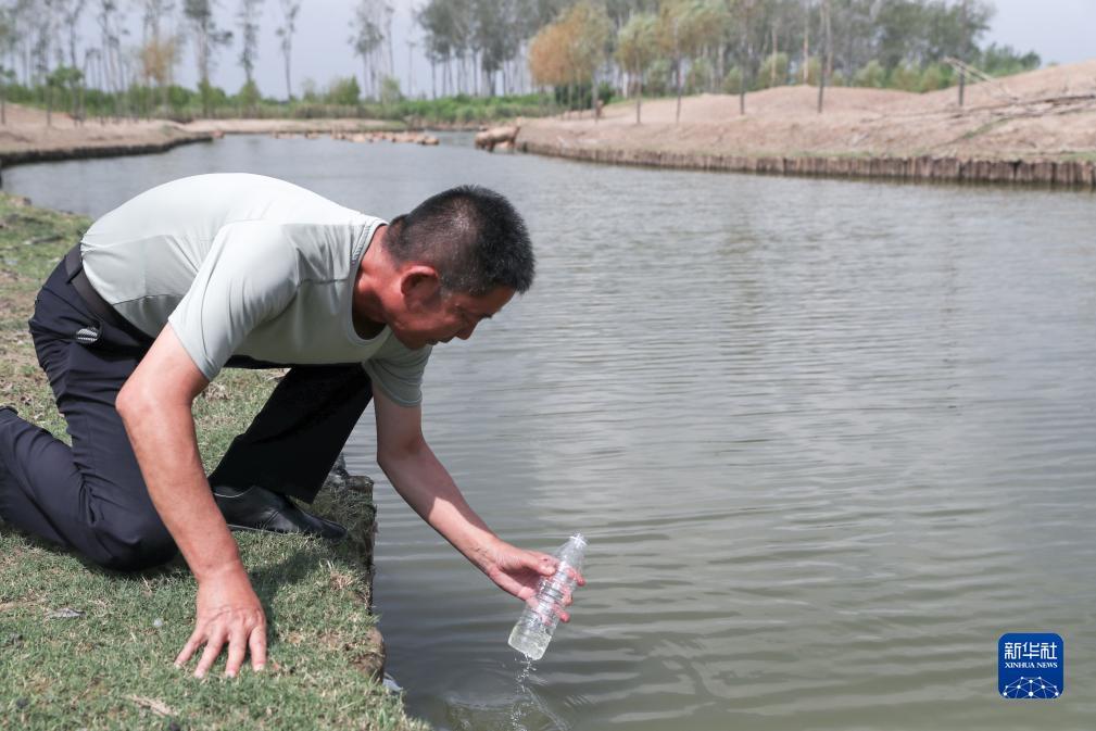 徐安宏在麋鹿活动区域采集水样(2023年8月21日摄)。新华社记者 杨磊 摄