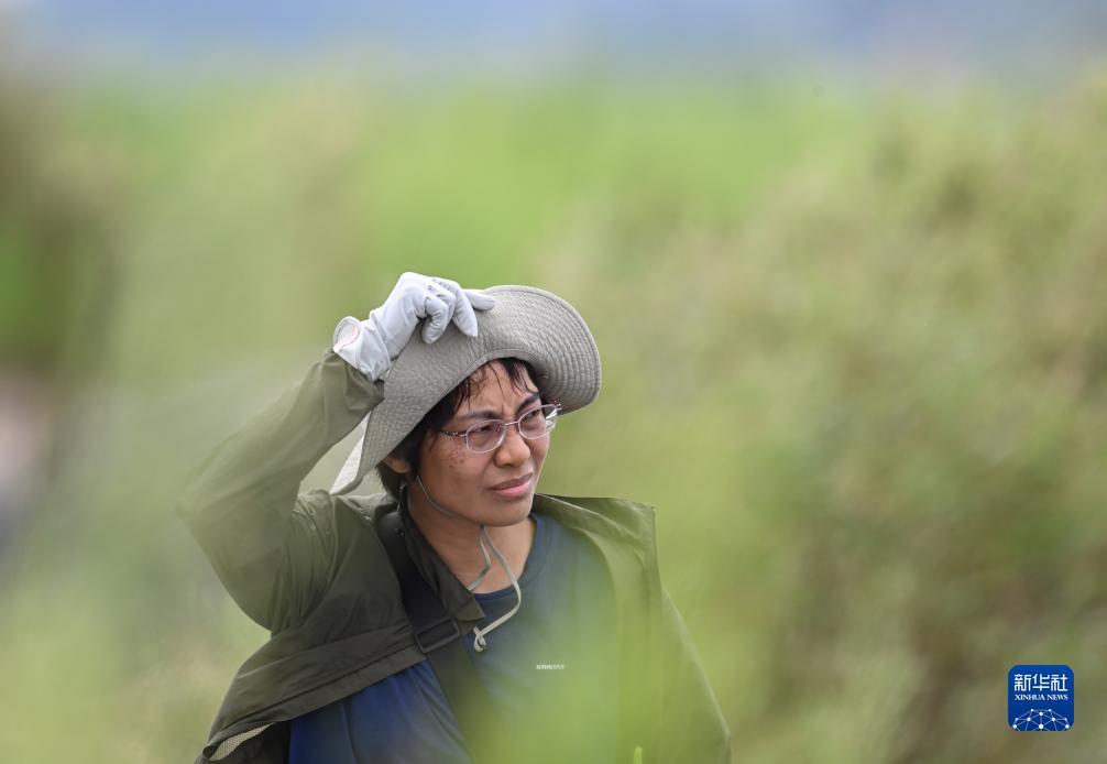 杨洪燕在东台条子泥湿地开展野外观测工作(2023年8月19日摄)。杨洪燕从2003年起开始中国滨海湿地及鸻鹬类研究工作,2020年加入北京林业大学生态与自然保护学院东亚-澳大利西亚候鸟迁徙研究中心,主持东台研究基地的野外研究工作,开始系统研究极危物种勺嘴鹬觅食行为、取食效率和能量积累等。新华社记者 季春鹏 摄