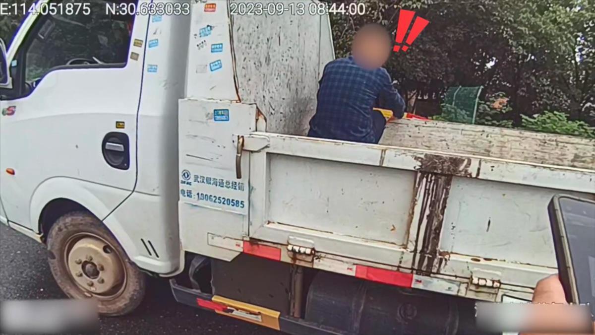 9月13日8时45分许,湖北高速交警在武汉绕城高速武汉北收费站执勤时,突然发现一辆轻型普通货车的货厢里居然蹲着一个人,而且车辆后方挡板缺失,一旦发生急刹,后果不堪设想。