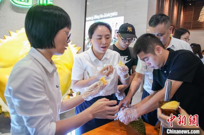 9月14日,广西南宁消费者抢“鲜”品尝产自马来西亚“猫山王之乡”——彭亨州劳勿县的榴莲。 中新社记者 陈冠言 摄