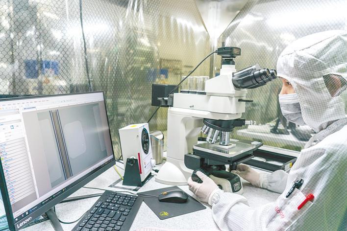 武汉云岭光电有限公司的技术人员借助高倍显微镜检测高速率光通信芯片。(湖北日报全媒记者 魏铼 摄)