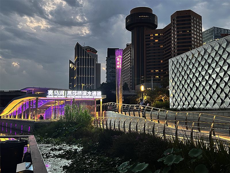 2019年,朝阳区启动了亮马河国际风情水岸项目建设,亮马河以河道复兴引领城市更新,形成“建筑-绿-水”的无缝衔接,打造了80万平方米的滨河公园,居民“推窗见绿、推门见景、沿河有荫”。75%的公共空间可为百姓提供休闲娱乐,沿河两岸,黑珍珠餐厅、网红咖啡馆、会客厅、百姓秀场、市民乐场,成为朝阳区提升生活品质和夜间经济的新亮点。