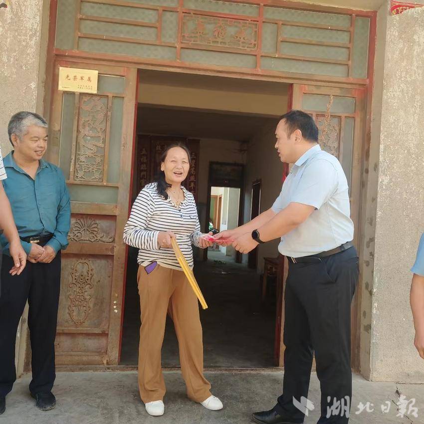 湖北日报客户端讯(通讯员李冉)敲锣打鼓送喜报,鞭炮齐鸣贺功臣,拥军优属暖人心。9月14日,保康县马桥镇党委副书记、政法委员王宝,镇退役军人事务工作站及张湾村党支部书记等人一行,为张湾村现役军人张世鹏家庭送去喜报和慰问金,为现役军人家属送去了党委、政府的关怀和真挚的问候。
